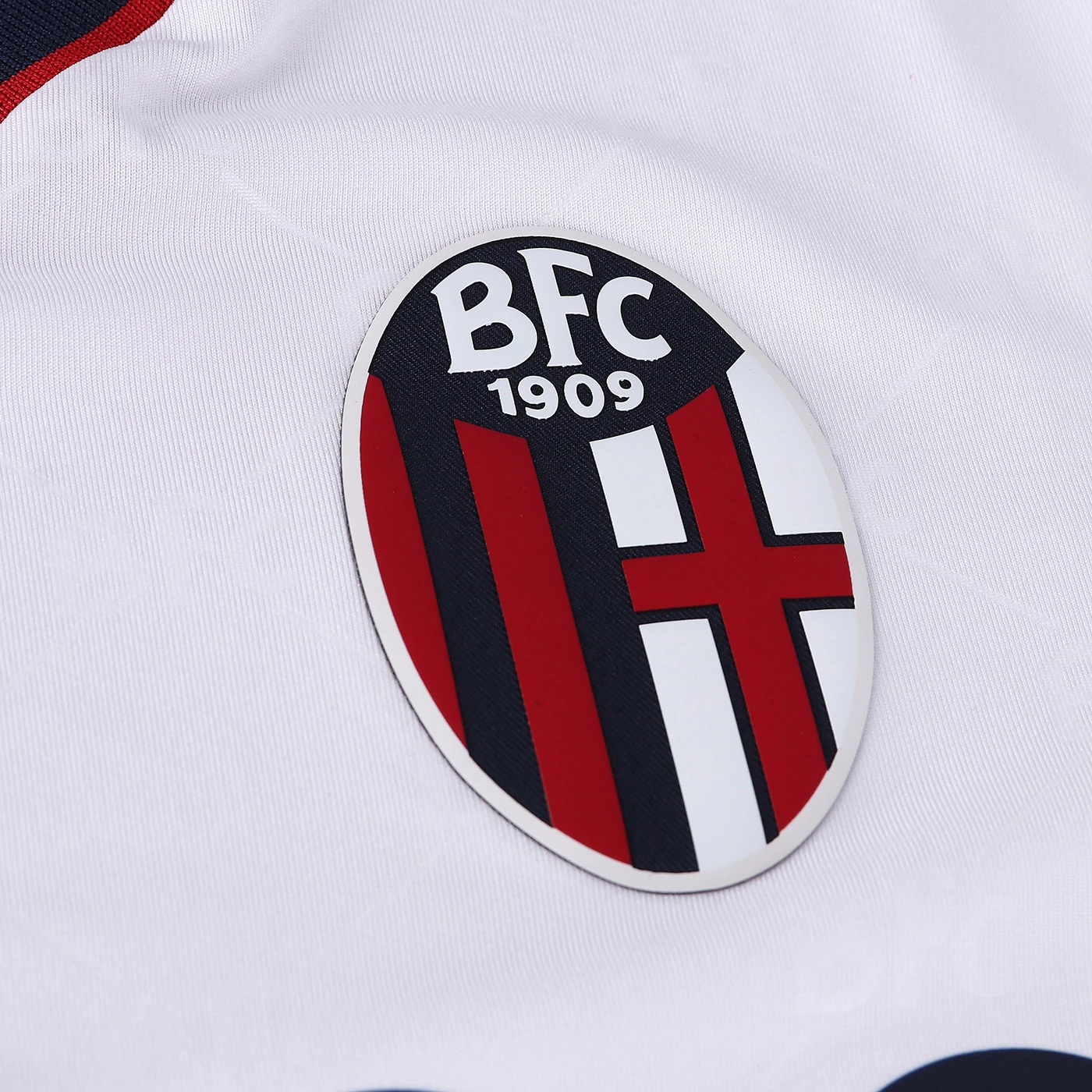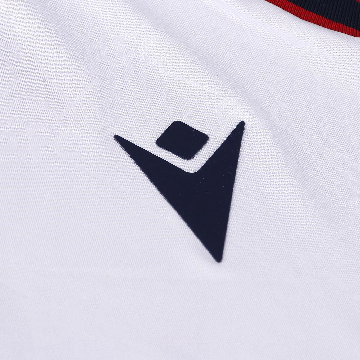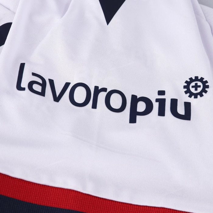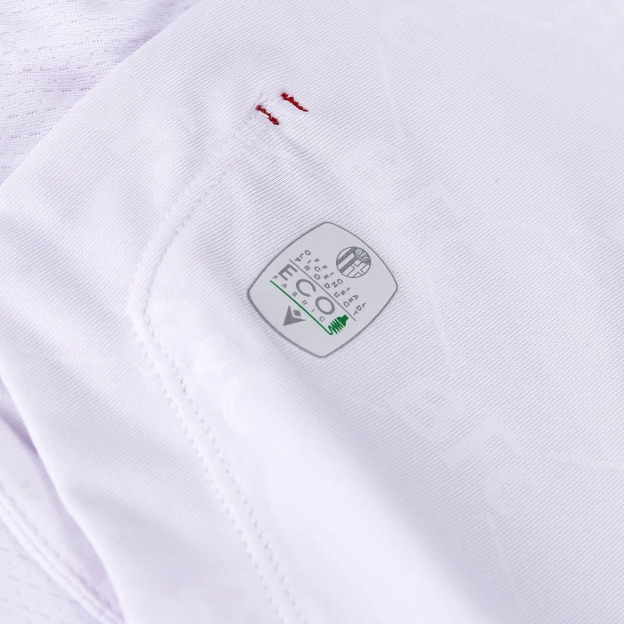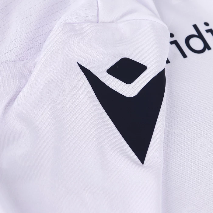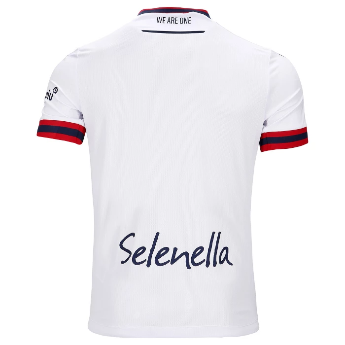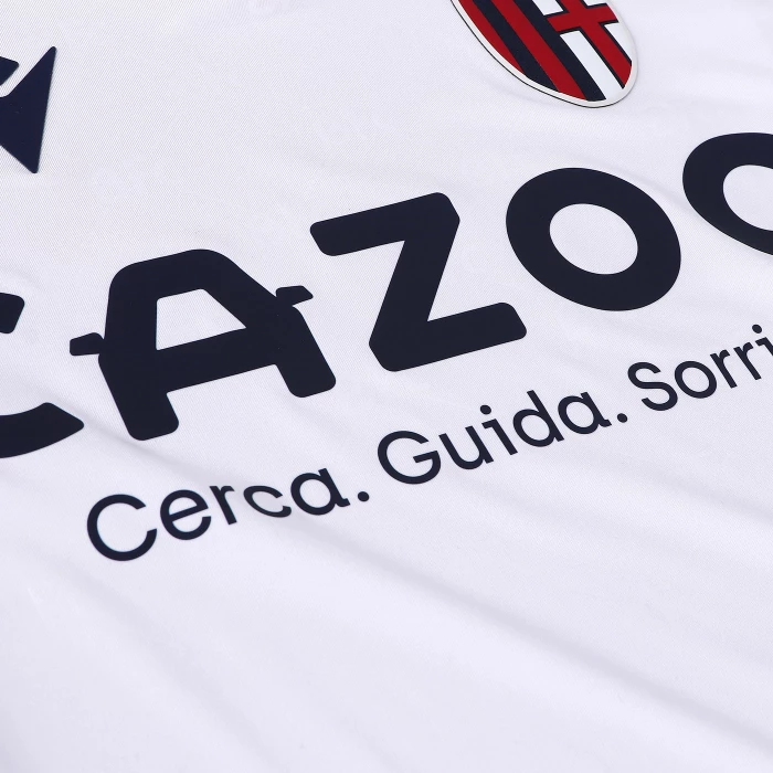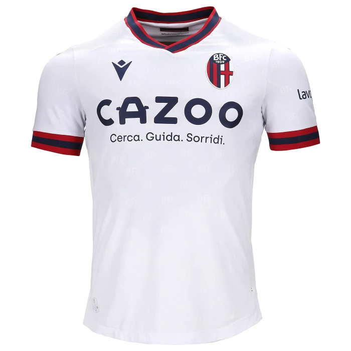 Second official short-sleeved shirt of Bologna FC 1909 for the 2022/2023 season.The shirt, which pays homage to the 90th anniversary of the European Cup, maintains traditional features but at the same time contains an innovative style and sophisticated graphics with inspirations from the world of fashion. The club and technical sponsor's shared commitment to the environment and sustainability also continues with the use of Eco-Fabric fabrics, made from recycled plastic, for the production of the kits.The innovative 'fashion' design also characterises the 'Away' kit. In this case, the jersey is white with a V-neck with red-blue edging, a colour combination that is also present on the sleeve edges. Also in this case the main feature is the embossed, all-over tone-on-tone graphics with the acronym BFC as the central element. On the back neck, in this case 'WE ARE ONE', the Club's identifying claim, is printed in blue. On the chest, in blue, the Macron Hero stands out on the right, on the left the logo of Bologna Fc 1909. The away kit is completed by blue shorts with a red-blue band on the thigh edge and white socks with a red-blue band on the upper edge.The shirt has a Body Fit fit, the main fabric used is Eco-Fabric, specifically EcoSirenaLight and the presence of the Eco micromesh(more...)