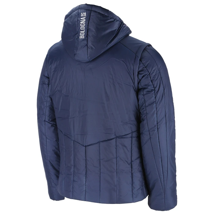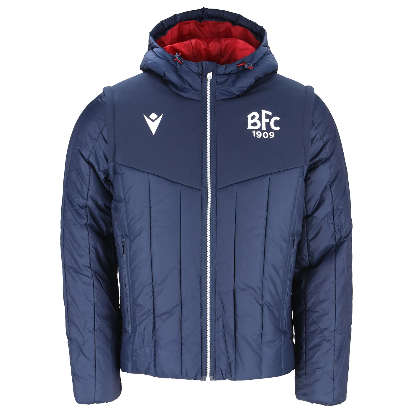 Padded hooded jacket with detachable sleeves. Full zip, zippered pockets and elastic cuffs. Bologna FC and Macron logos.