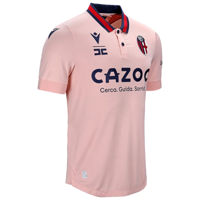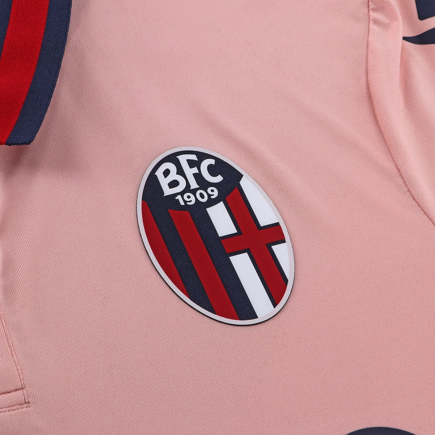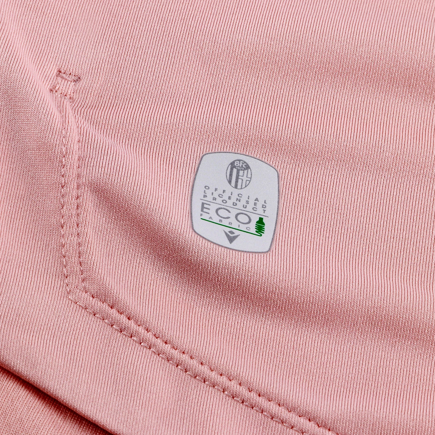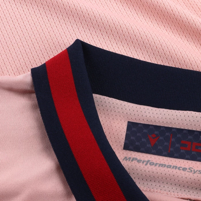 The technical characteristics (fabrics, fit, design, technicality) are based on the Home and Away 22-23 models, but with details that make this fourth shirt unique, starting with the pink colour that characterises the whole garment. The only exception is the polo collar with two-button closure and knitted sail. The backneck is personalised and dedicated to the collaboration with Elisabetta Franchi, whose logo, together with the Macron Hero, is featured in red on a blue background. Both logos, in silicone material, are also present one below the other on the right side of the chest, while on the left we find the Bologna coat of arms. Finally, on the back neck we find in blue 'WE ARE ONE', the club's identifying claim. The shirt will be matched with blue shorts with red and blue stripes on the bottom leg and blue socks with red stripes.