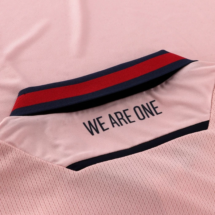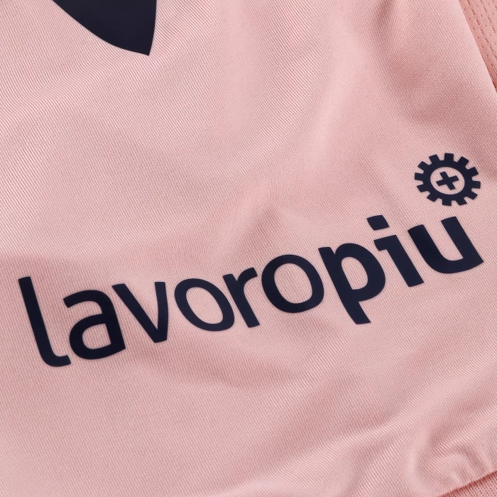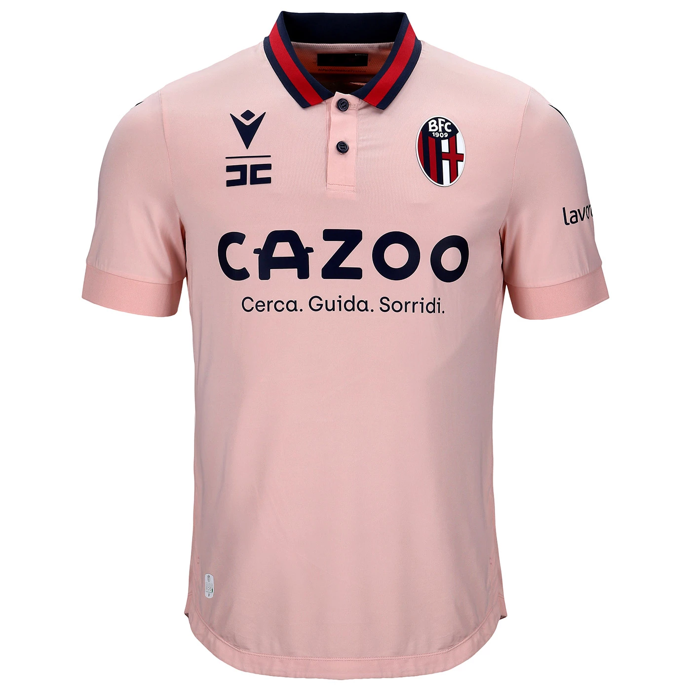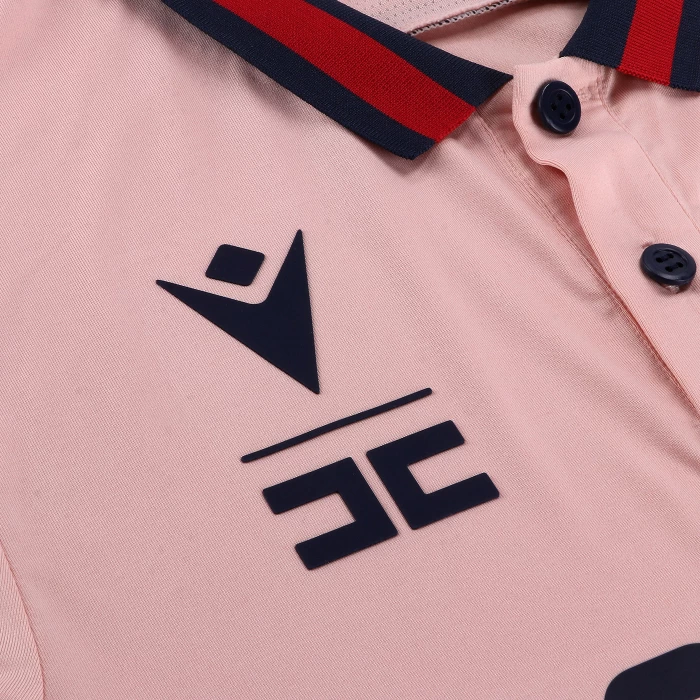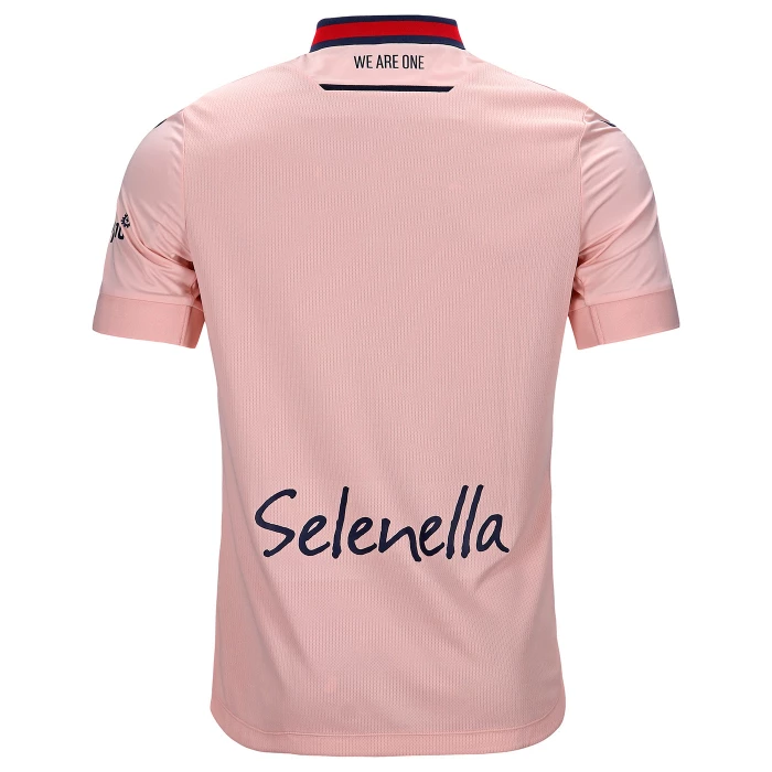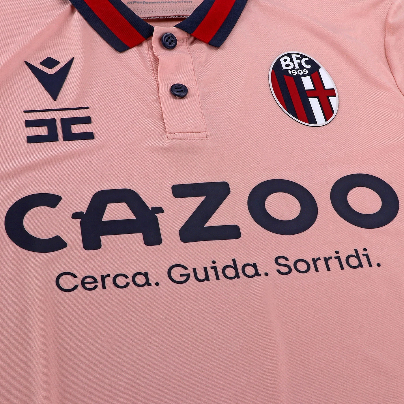 The technical characteristics (fabrics, fit, design, technicality) are based on the Home and Away 22-23 models, but with details that make this fourth shirt unique, starting with the pink colour that characterises the whole garment. The only exception is the polo collar with two-button closure and knitted sail. The backneck is personalised and dedicated to the collaboration with Elisabetta Franchi, whose logo, together with the Macron Hero, is featured in red on a blue background. Both logos, in silicone material, are also present one below the other on the right side of the chest, while on the left we find the Bologna coat of arms. Finally, on the back neck we find in blue 'WE ARE ONE', the club's identifying claim. The shirt will be matched with blue shorts with red and blue stripes on the bottom leg and blue socks with red stripes.