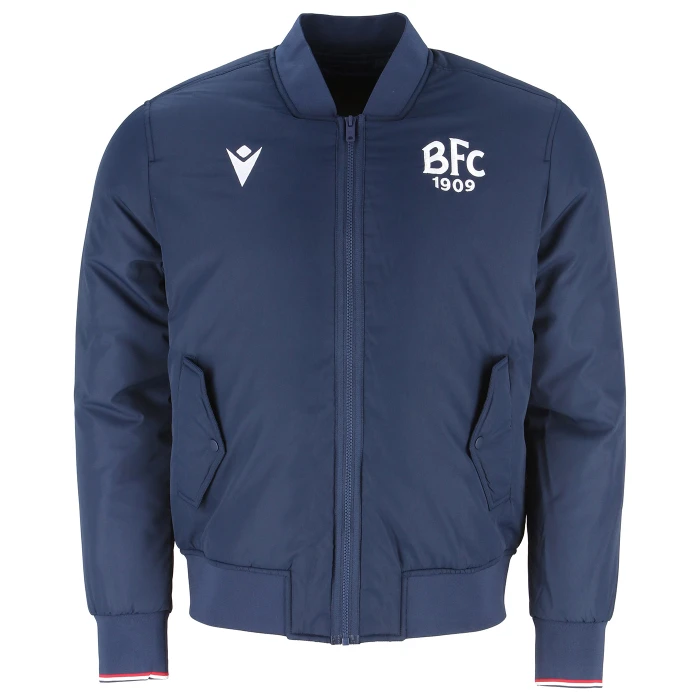 Light bomber jacket with full front zip. Rib-knit collar, buttoned pockets, and elasticated rib-knit cuffs and hem. Embroidered Bologna FC, Macron logos, and "Bologna FC 1909" lettering on the back.