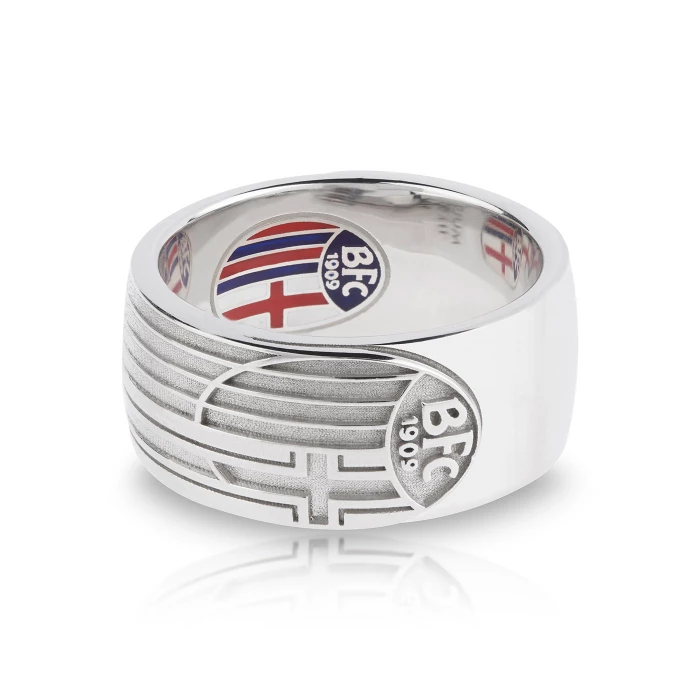 L'anello che celebra la fede per il Bologna FC. WE ARE BOLOGNA Loro la squadra, noi i tifosi, tutti insieme siamo il Bologna. Una storia centenaria che unisce innovazione e rispetto della tradizione dentro e fuori dal campo, un senso di appartenenza che ci guida nella costruzione di esperienze emozionanti e che non ci fa mai sentire soli. Il design del gioiello racconta un simbolo di appartenenza rimasto immutato nel tempo. Lo stemma, di forma ovale, è protagonista indiscusso. In alto, ben visibile, la sigla BFC e l'anno di fondazione (1909) della squadra. Sulla destra la croce bordata che richiama la storia della grande città di Bologna. Un emblema che diventa simbolo di fede sportiva, un segno di riconoscimento ricco di grandi soddisfazioni da ricordare, unito ad una storia ancora tutta da scrivere insieme. Purezza, linearità e cuore rossoblù si fondono “nell’unico grande rito rimasto al nostro tempo”. Argento 925 rodiato. Su prenotazione. L'ordine verrà evaso entro 7/10 giorni.CORDINO IN OMAGGIO