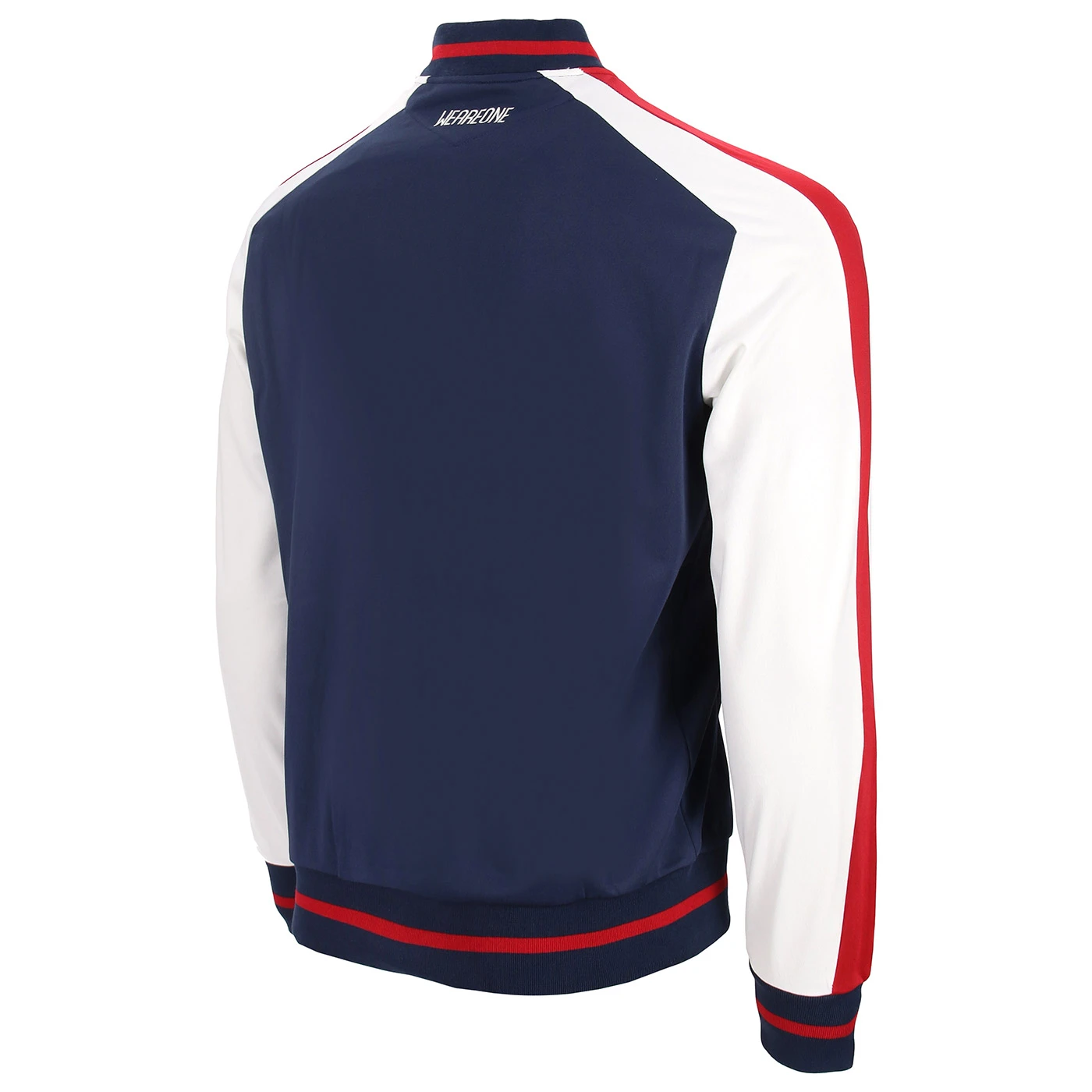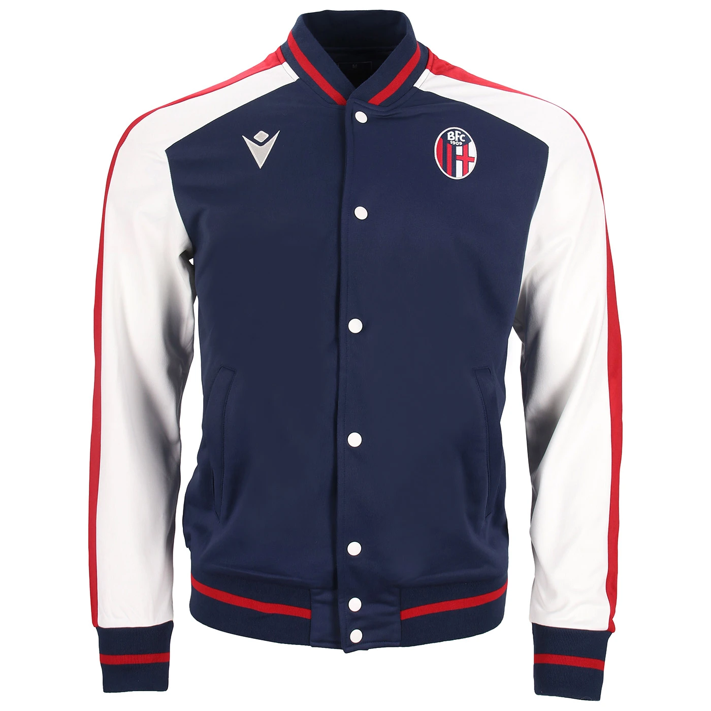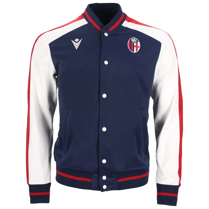 Giacca stile college con chiusura a bottoni. Maniche in colore a contrasto, tasche laterali, polsini e fondo giacca elasticizzati. Loghi Bologna FC e Macron.