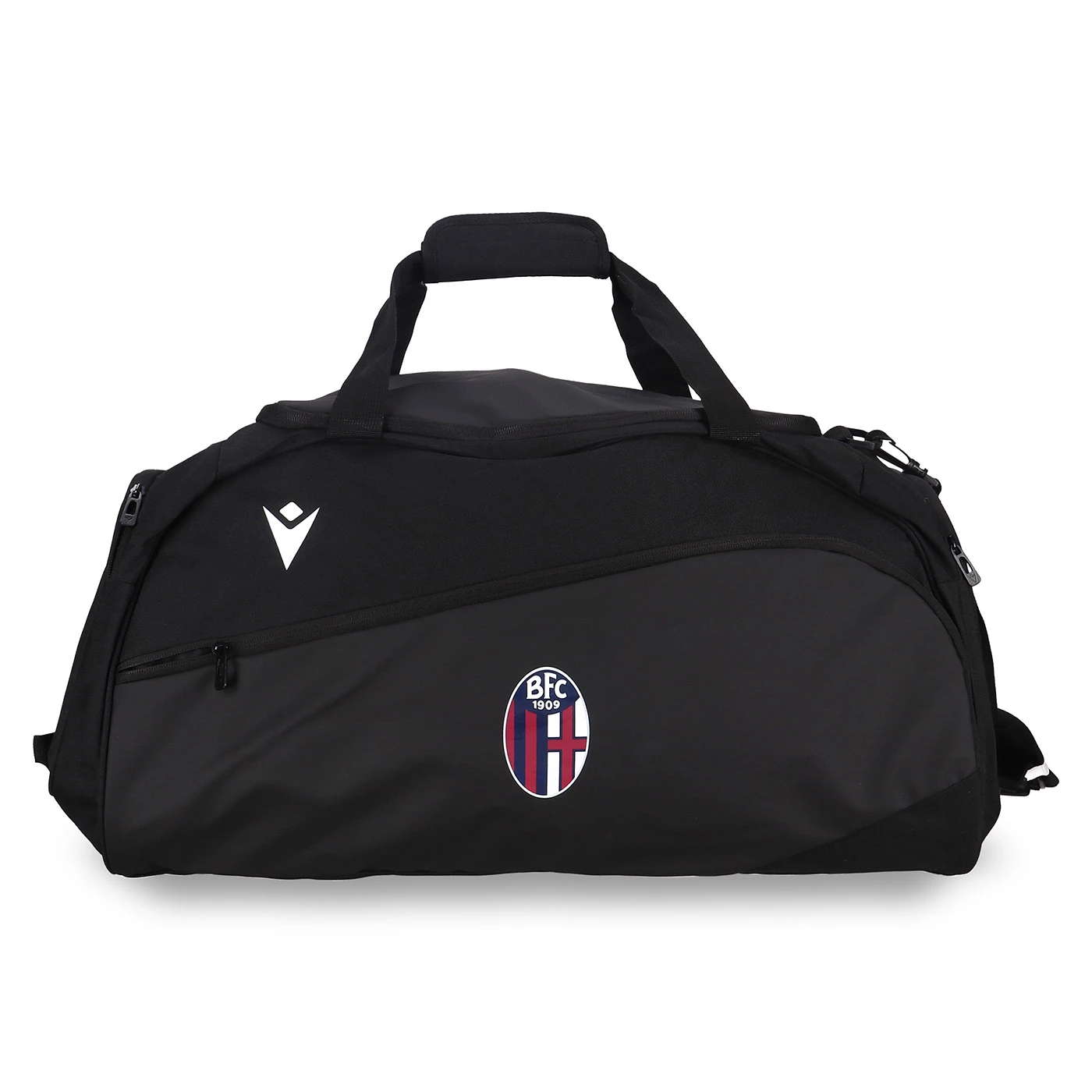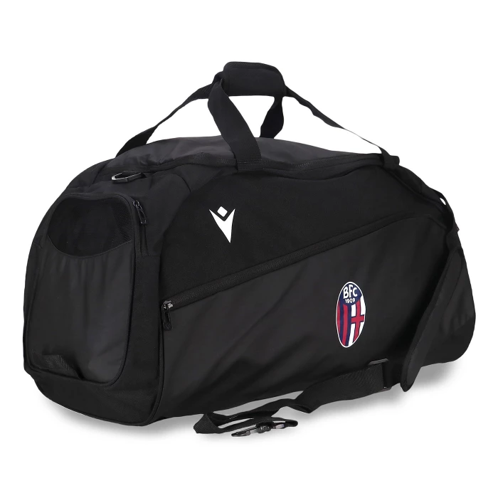 100% poliestere. Dimensioni: 60 x 33 x 32 cm. Capacità 58 litri. Borsone con tracolla. Loghi Bologna FC e Macron.