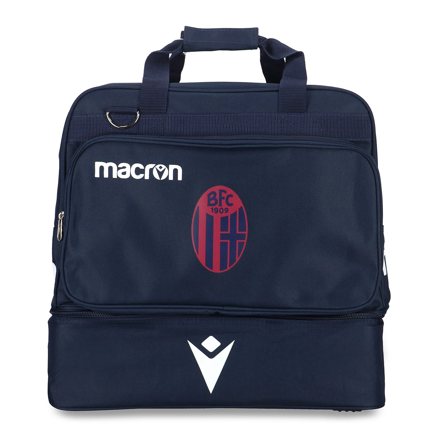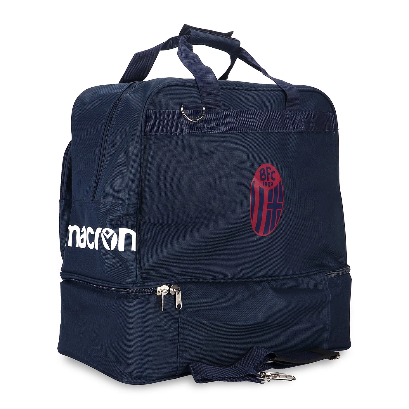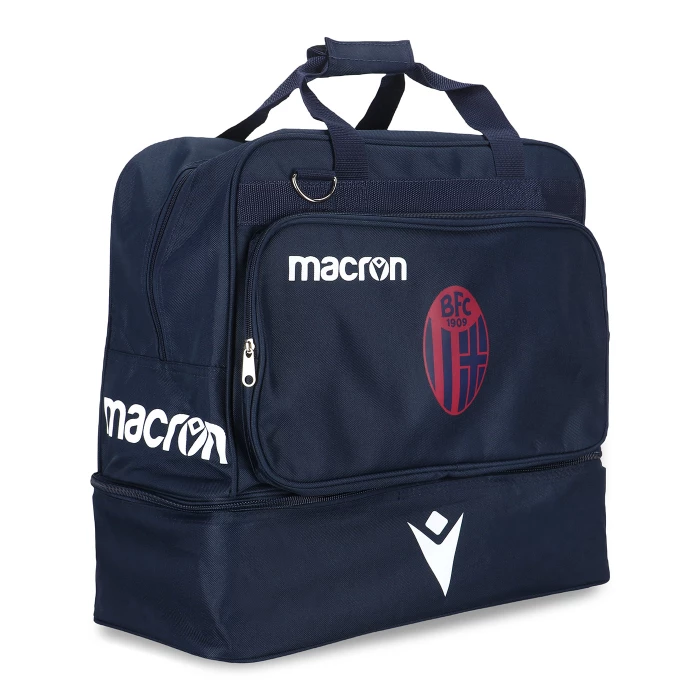 100% poliestere. Borsone squadra con doppio fondo rigido. Dimensioni: 48 x 24 x 48 cm. Capienza 55 litri. Loghi Bologna FC e Macron.