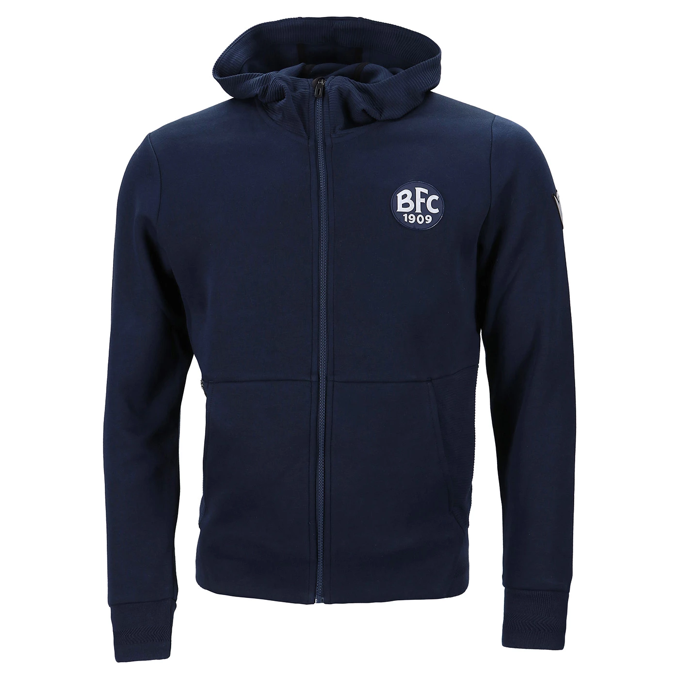 100% poliestere. Felpa con cappuccio e zip intera frontale. Tasche laterali con zip. Patch gommato BFC1909 applicato sul petto, logo Macron sulla manica sinistra.