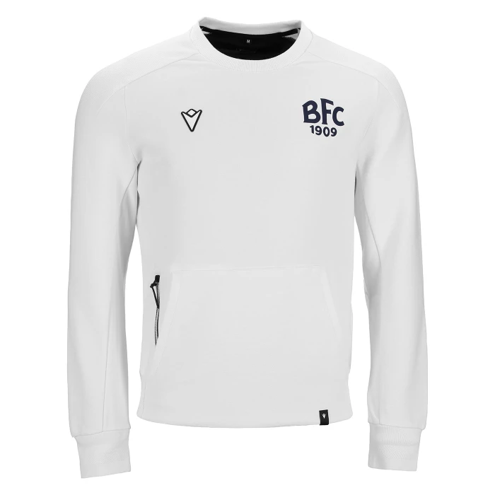 70% cotone, 30% poliestere. Felpa girocollo con fondo top e polsini elasticizzati. Tascone frontale e tasca laterale con zip. Loghi Macron e BFC 1909.