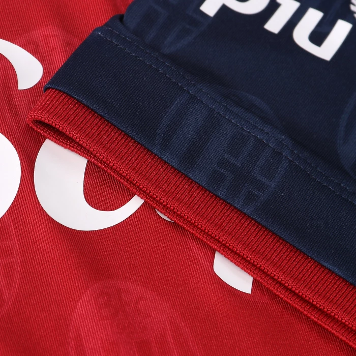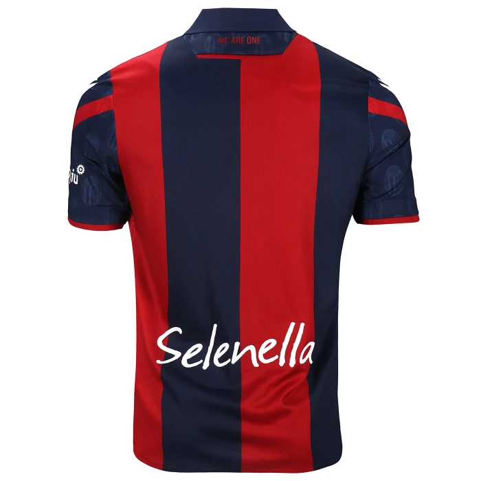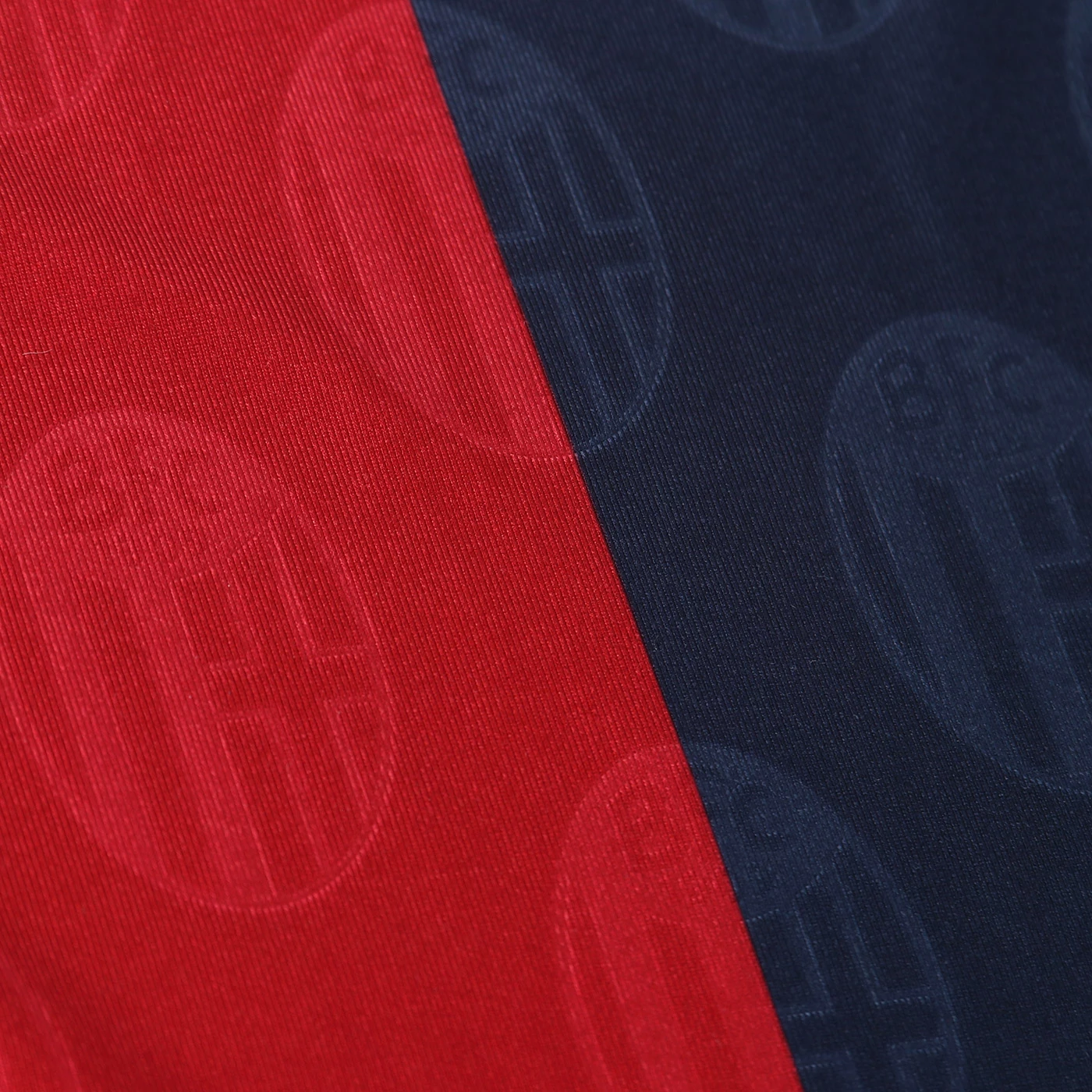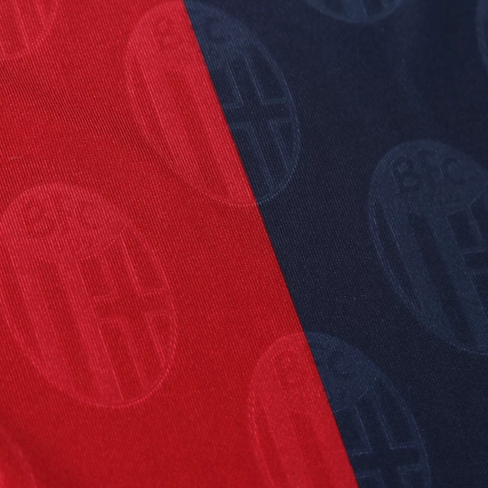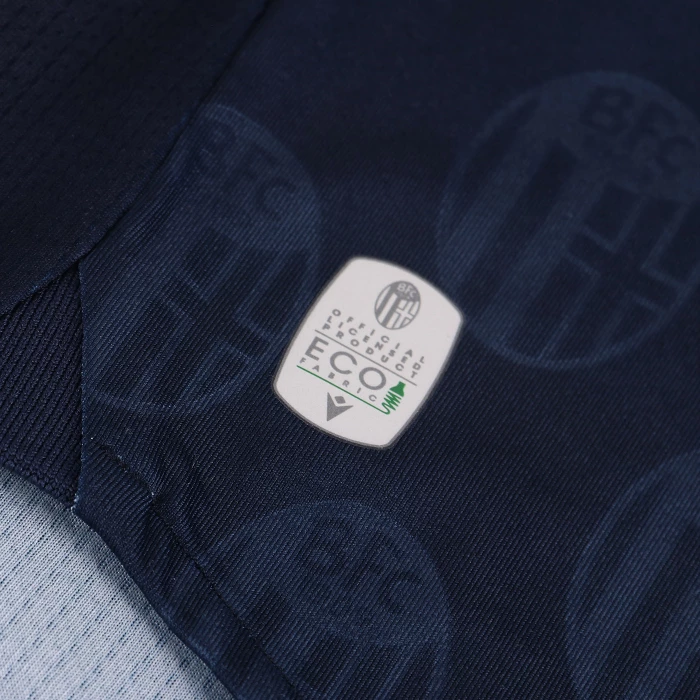 ONORA IL ROSSO E IL BLU, LA VITA IN UNA MAGLIA. La nuova maglia gara Home ha il collo a polo in maglieria blu con scollo a V. La maglia ha quattro bande verticali rossoblù all'interno delle quali, tono su tono, in grafica embossata, sono presenti i loghi del Bologna FC 1909. Le maniche sono blu con bordo rosso, il retro del collo è personalizzato con la scritta LO SQUADRONE CHE TREMARE IL MONDO FA, il logo Macron e la scritta Designed in Bologna che certifica come ogni capo sia ideato, progettato e sviluppato nel quartier generale dello sponsor tecnico. Nel retrocollo esterno, è stampata in rosso WE ARE ONE, claim identificativo del Club. Sul petto, in stampa siliconata, a sinistra, il logo del Bologna Fc 1909, a destra e in bianco il Macron Hero. Un design ispirato al mondo della moda, in continuità con la maglia della stagione 22-23, caratterizzato in questo caso da un pattern allover di loghi BFC disposti in diagonale. Continua inoltre l'impegno condiviso tra club e sponsor tecnico nei confronti dell'ambiente e della sostenibilità , con l'utilizzo di tessuti Eco Fabric, al 100% provenienti da plastica riciclata, per la produzione dei kit gara. I nuovi due kit 2023-2024 hanno una vestibilità Body Fit, il principale tessuto utilizzato è Eco-Fabric, nello specifico EcoSirenaLigh(more...)
