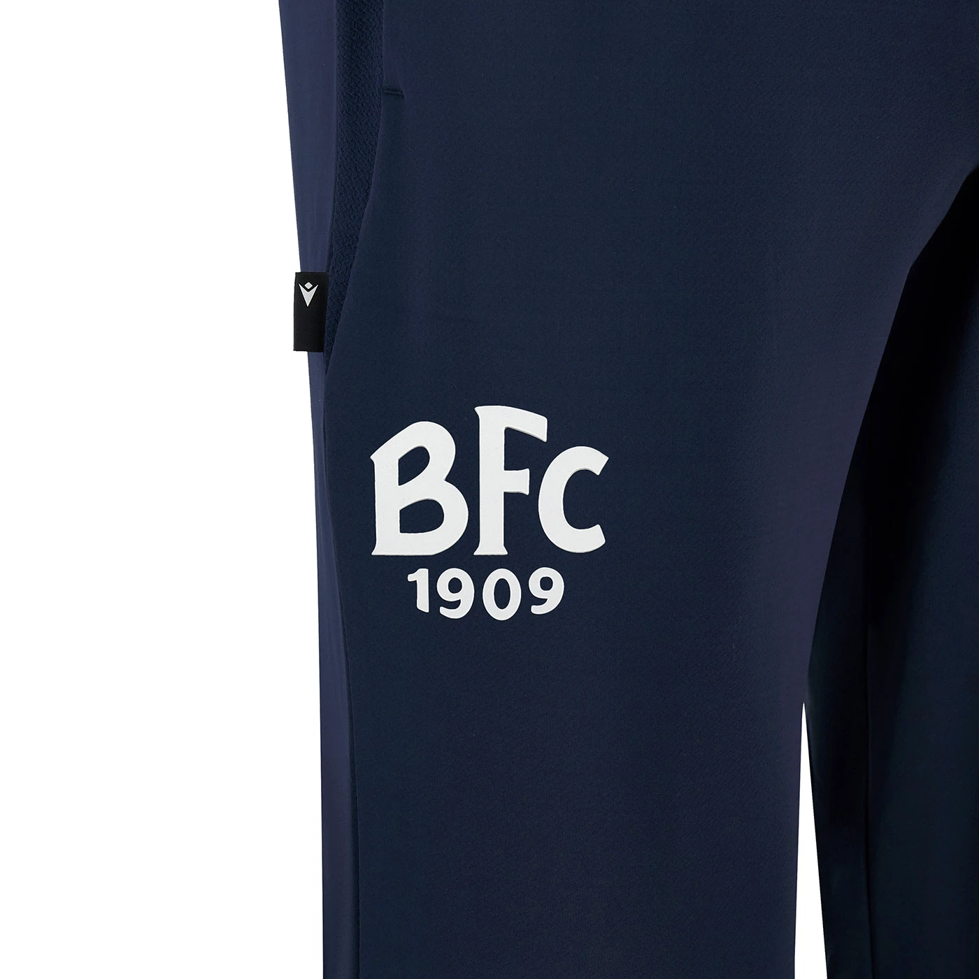 100% poliestere. Pantaloni sportivi con coulisse e girovita elastico. Polsini sul fondo gamba. Tasche laterali. Loghi Macron e BFC1909.