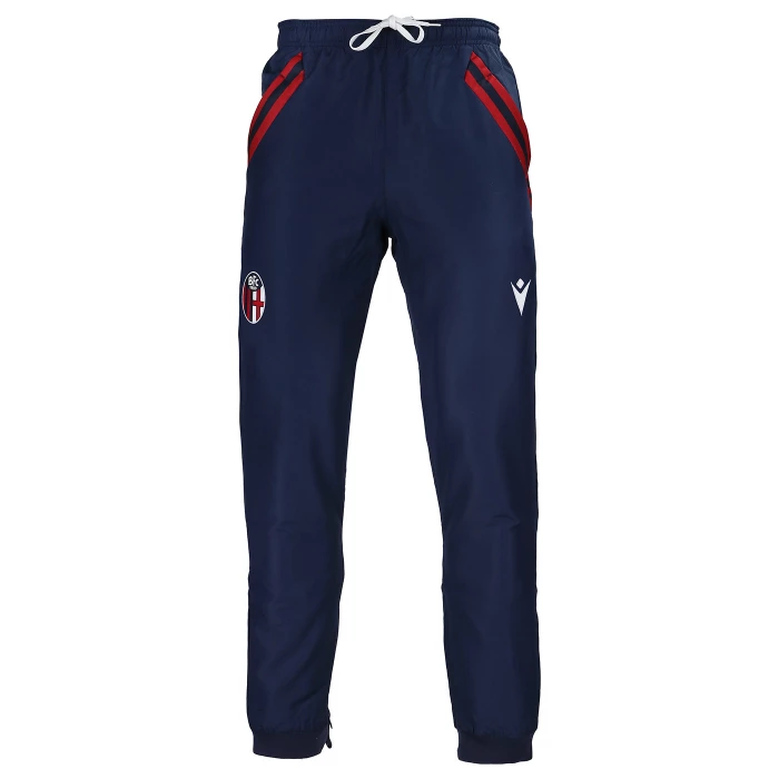100% poliestere. Pantaloni rappresentanza con tasche laterali con zip, taschino sul retro con zip. Zip su fondo gamba. Loghi Bologna FC e Macron.