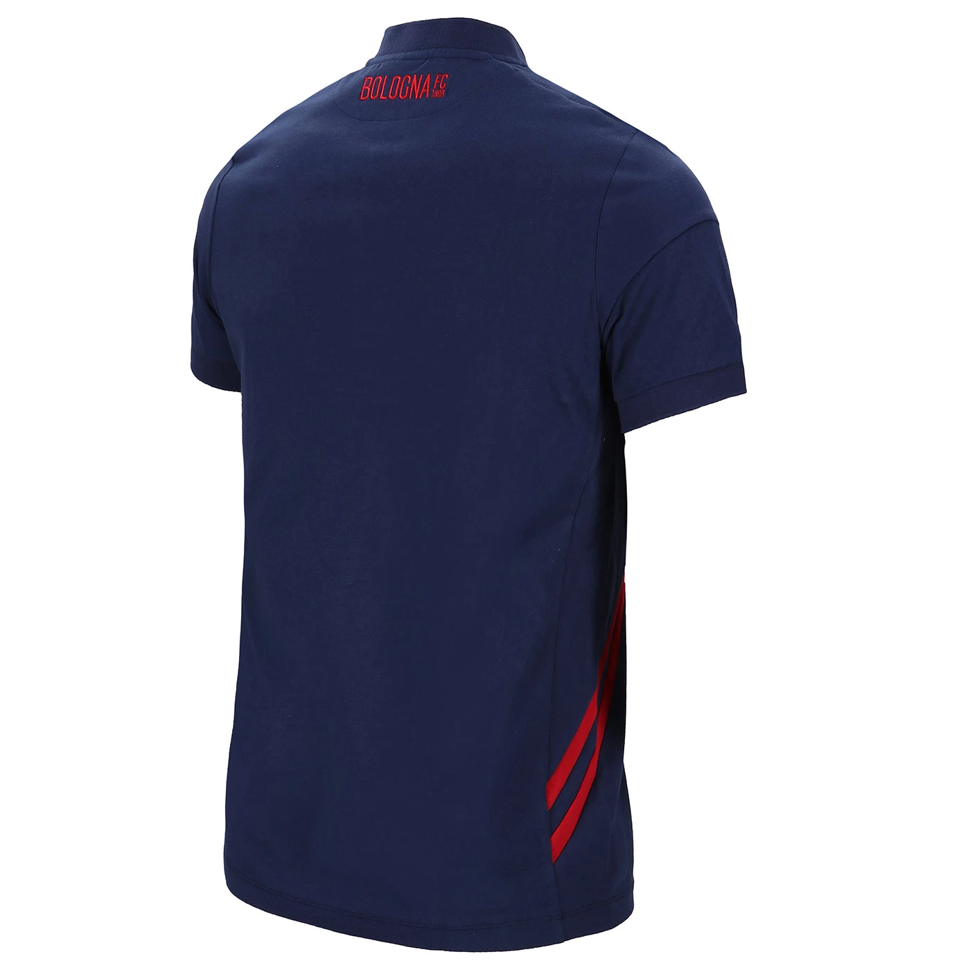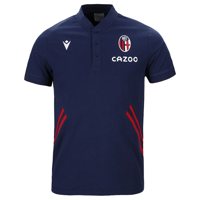 50% poliestere, 50% cotone. Polo rappresentanza a manica corta. Colletto alla coreana. Loghi Bologna FC e Macron.