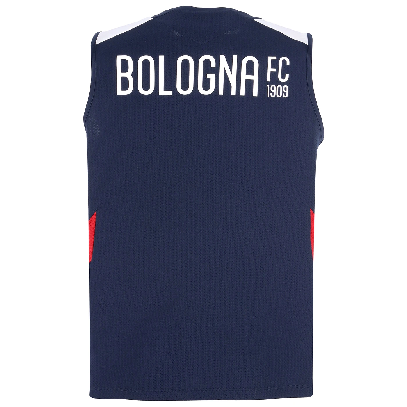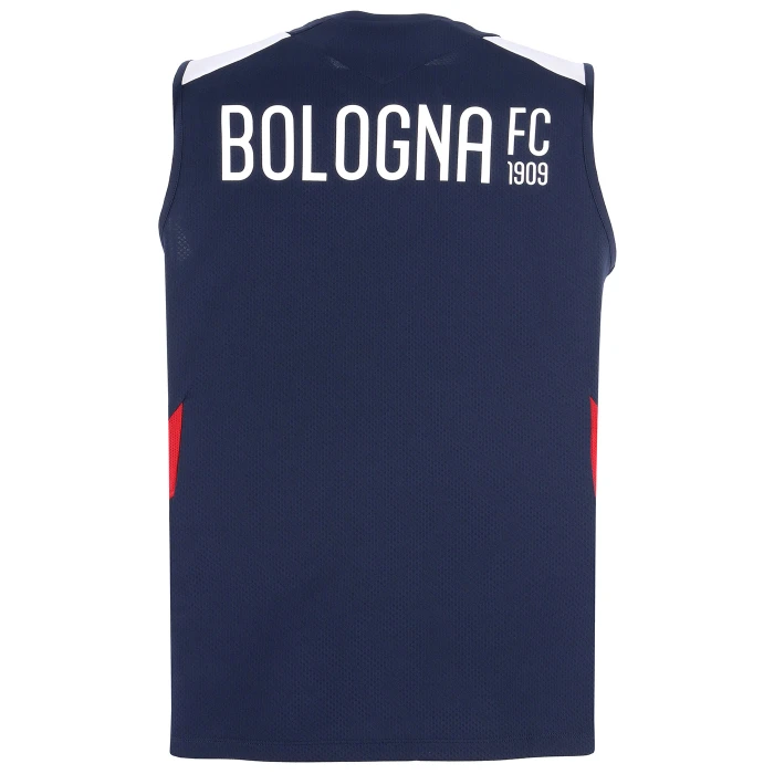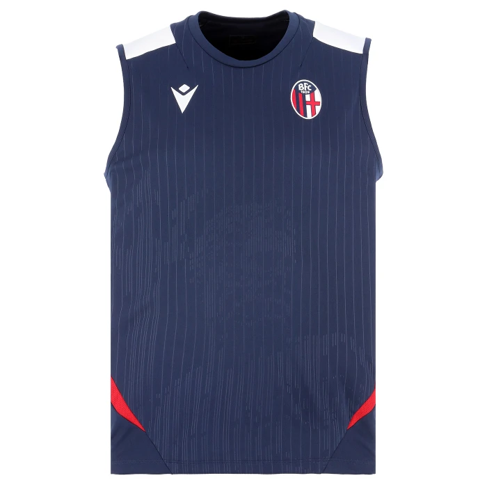 Maglia allenamento girocollo senza maniche. Inserti in mesh. Pannello sulla schiena in micromesh per migliorare la traspirazione. Loghi Bologna FC e Macron.
