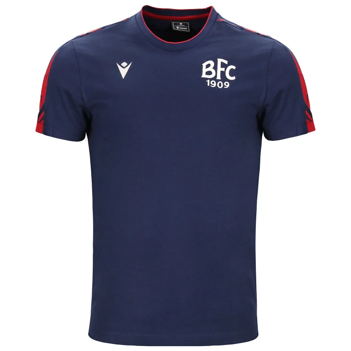 60% cotone, 40% poliestere. T-shirt girocollo e manica corta con applicazioni su spalle e maniche. Loghi Bologna FC e Macron.