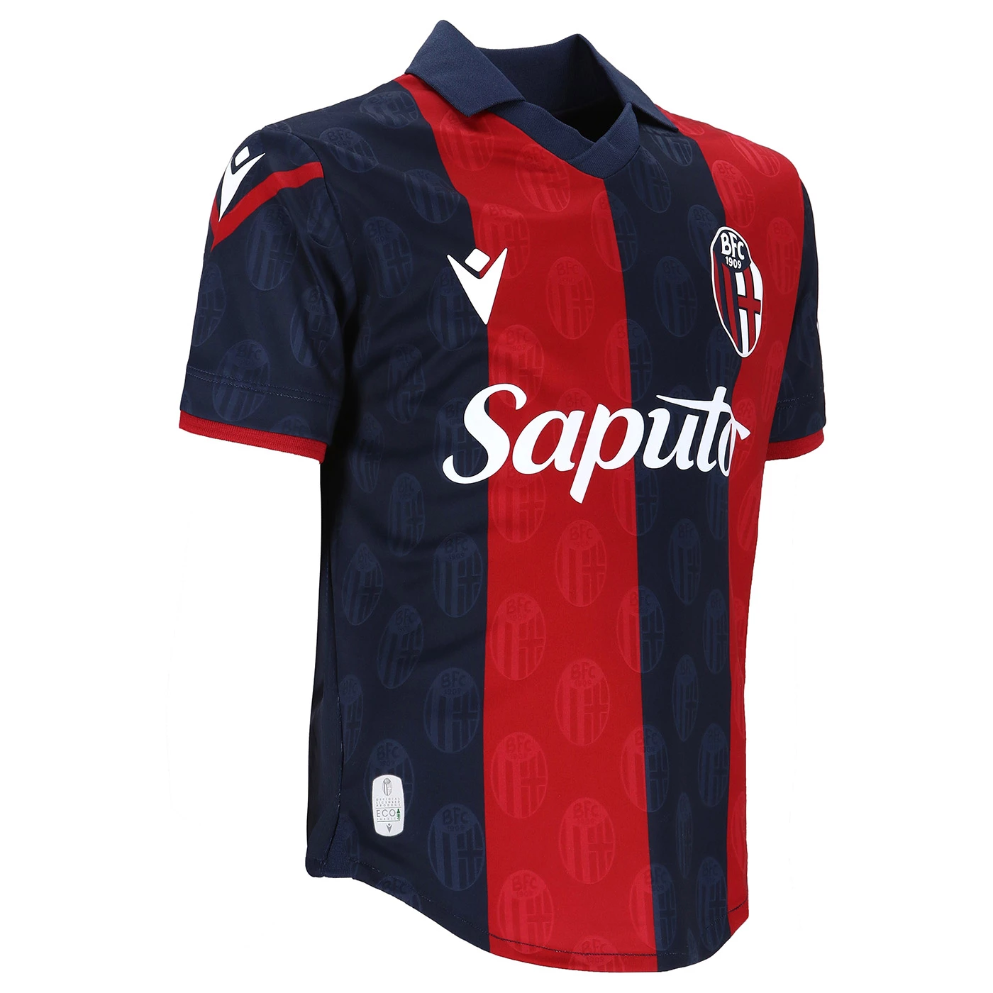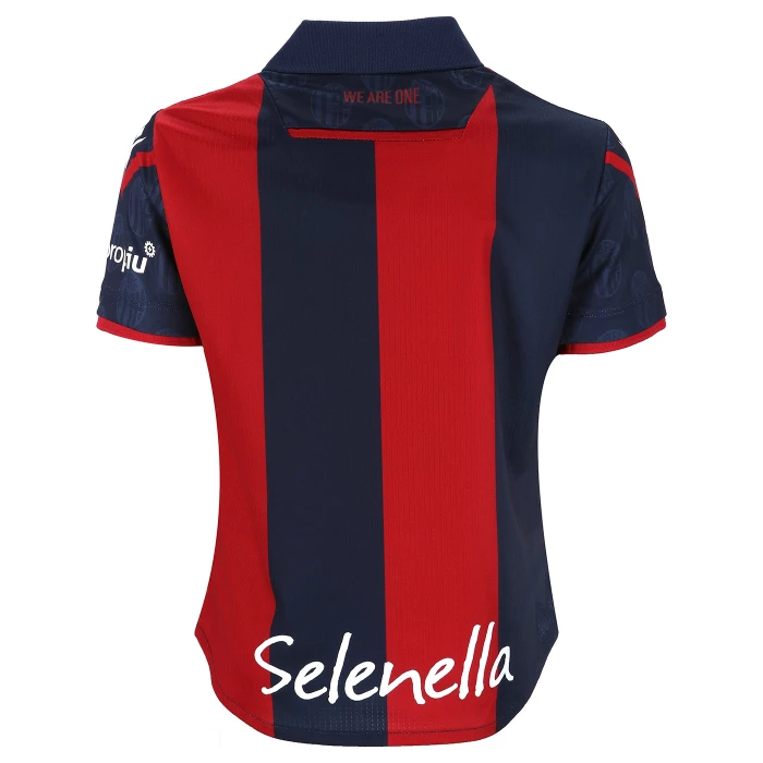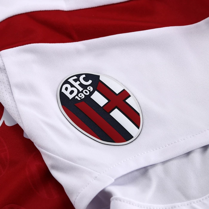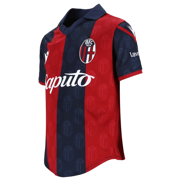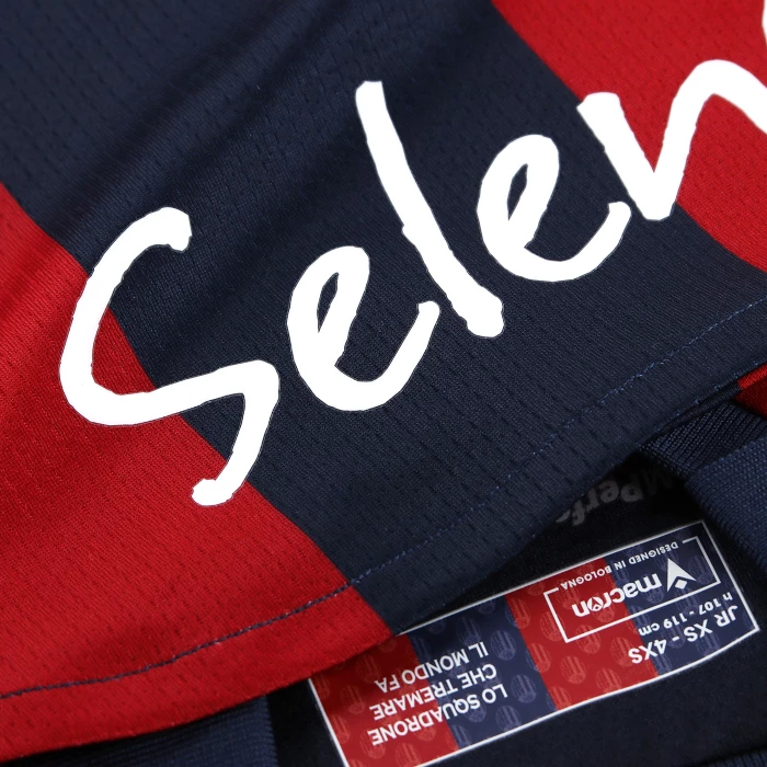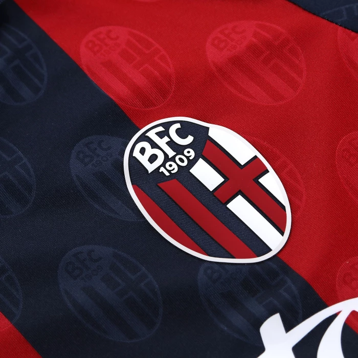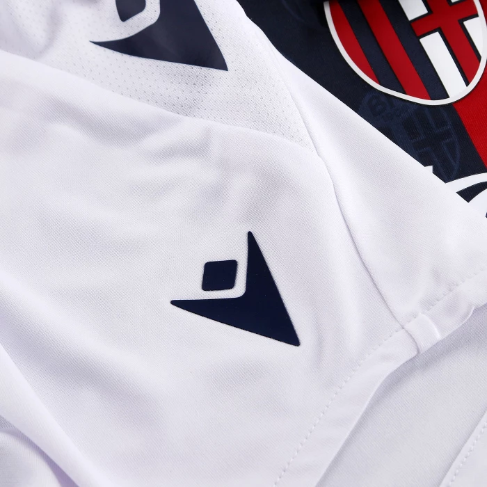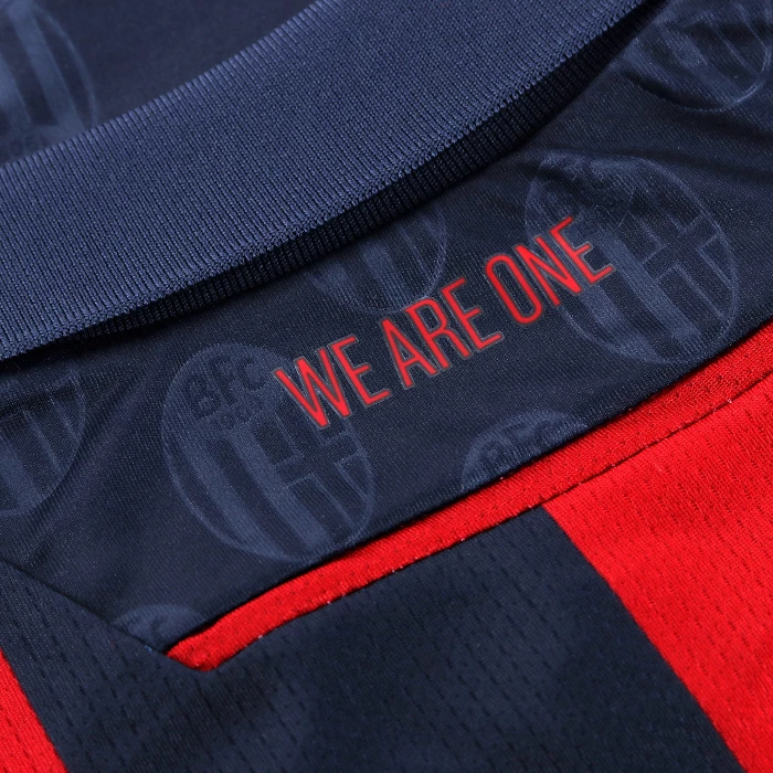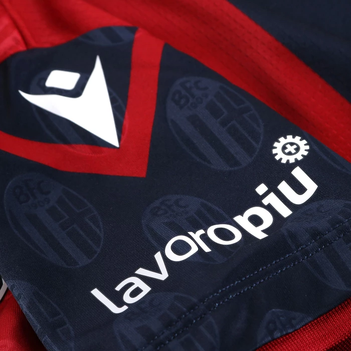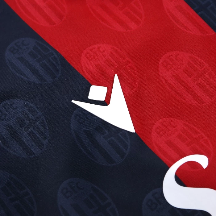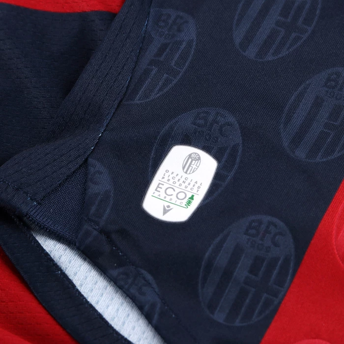 HONOUR THE RED AND BLUE, LIFE IN A SHIRT. The new 'Home' has a blue knit polo collar with a V-neck. The shirt has four vertical red-blue bands inside which, tone on tone, in embossed graphics, are the logos of Bologna FC 1909. The sleeves are blue with a red border, the back of the collar is customised with the words 'LO SQUADRONE CHE TREMARE IL MONDO FA' (THE TEAM THAT THREATS THE WORLD), the Macron logo and the words 'Designed in Bologna', which certify that each garment is conceived, designed and developed in the headquarters of the technical sponsor. On the outer back collar, 'WE ARE ONE', the club's identifying claim, is printed in red. On the chest, in silicon print, on the left, the logo of Bologna Fc 1909, on the right and in white the Macron Hero. A design inspired by the world of fashion, in continuity with the shirt of the 22-23 season, characterised in this case by an allover pattern of BFC logos arranged diagonally. The shared commitment between club and technical sponsor towards the environment and sustainability also continues, with the use of Eco Fabric fabrics, 100% from recycled plastic, for the production of the match kits. The new two 2023-2024 kits have a body fit, the main fabric used is Eco-Fabric, specifically EcoSirenaLight, and the presence of the Eco mi(more...)