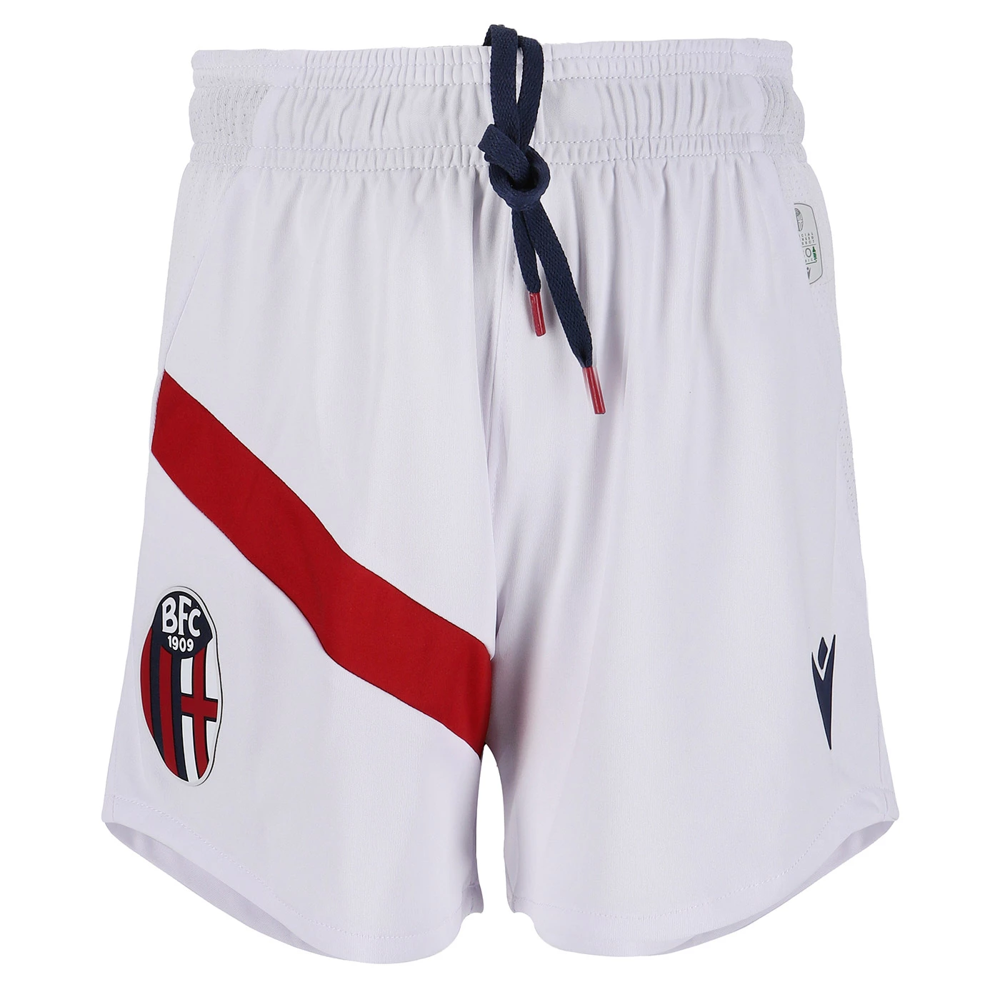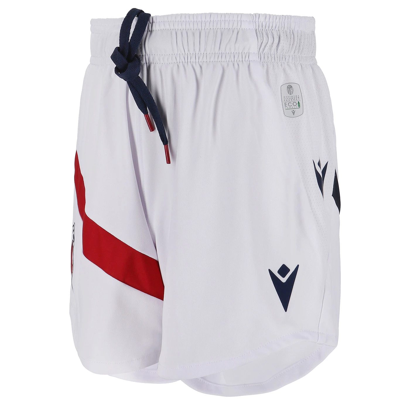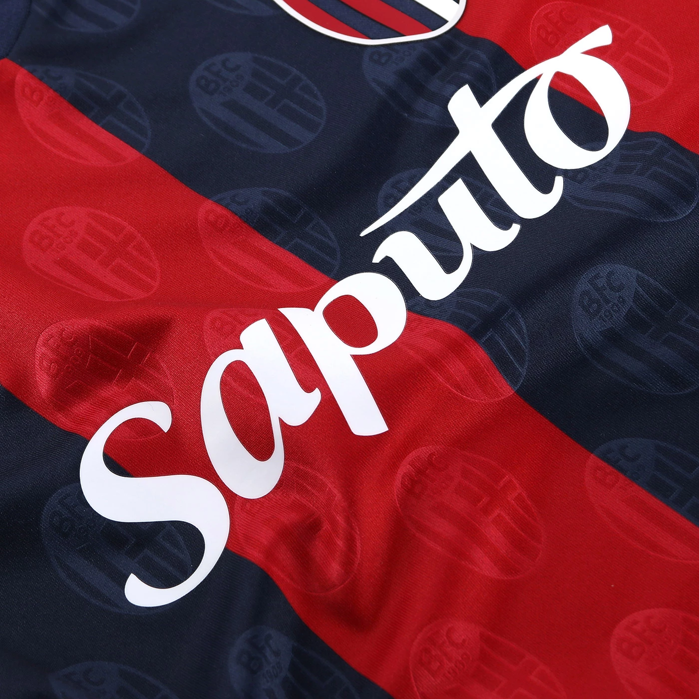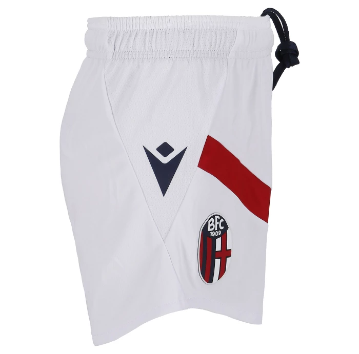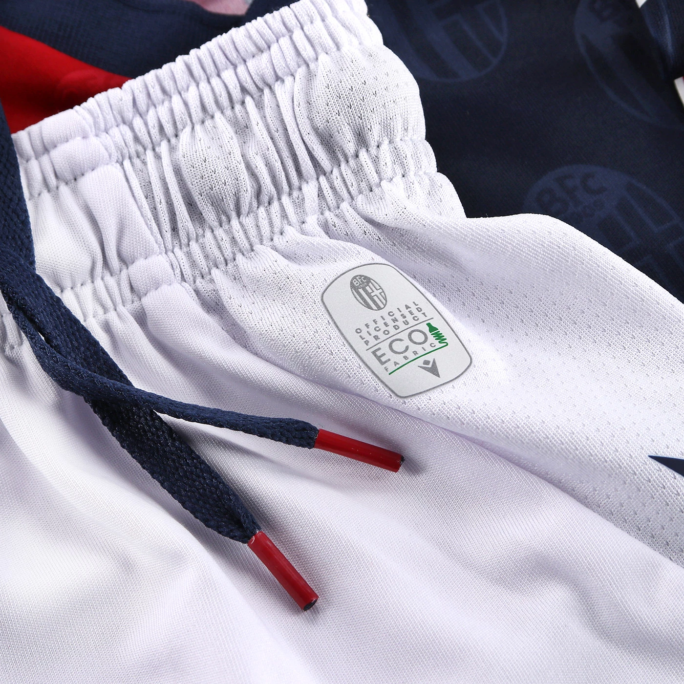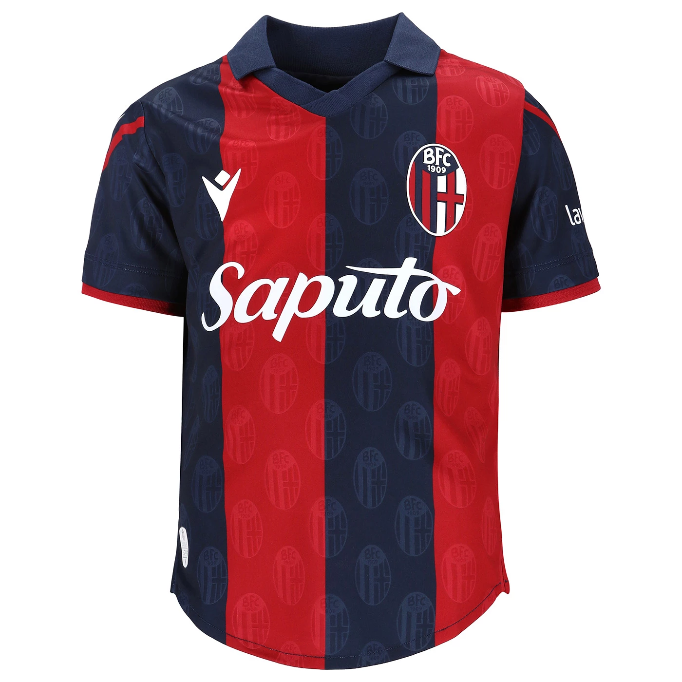 HONOUR THE RED AND BLUE, LIFE IN A SHIRT. The new 'Home' has a blue knit polo collar with a V-neck. The shirt has four vertical red-blue bands inside which, tone on tone, in embossed graphics, are the logos of Bologna FC 1909. The sleeves are blue with a red border, the back of the collar is customised with the words 'LO SQUADRONE CHE TREMARE IL MONDO FA' (THE TEAM THAT THREATS THE WORLD), the Macron logo and the words 'Designed in Bologna', which certify that each garment is conceived, designed and developed in the headquarters of the technical sponsor. On the outer back collar, 'WE ARE ONE', the club's identifying claim, is printed in red. On the chest, in silicon print, on the left, the logo of Bologna Fc 1909, on the right and in white the Macron Hero. A design inspired by the world of fashion, in continuity with the shirt of the 22-23 season, characterised in this case by an allover pattern of BFC logos arranged diagonally. The shared commitment between club and technical sponsor towards the environment and sustainability also continues, with the use of Eco Fabric fabrics, 100% from recycled plastic, for the production of the match kits. The new two 2023-2024 kits have a body fit, the main fabric used is Eco-Fabric, specifically EcoSirenaLight, and the presence of the Eco mi(more...)